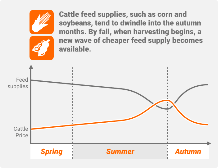 Based on historical data, cattle prices tend to increase just before and during the summer months – but not necessarily because it is prime grilling season. After all, the feeder cattle used to supply that beef were already being priced back in February and March. Conversely, summer is when feed supplies are lower and more expensive.